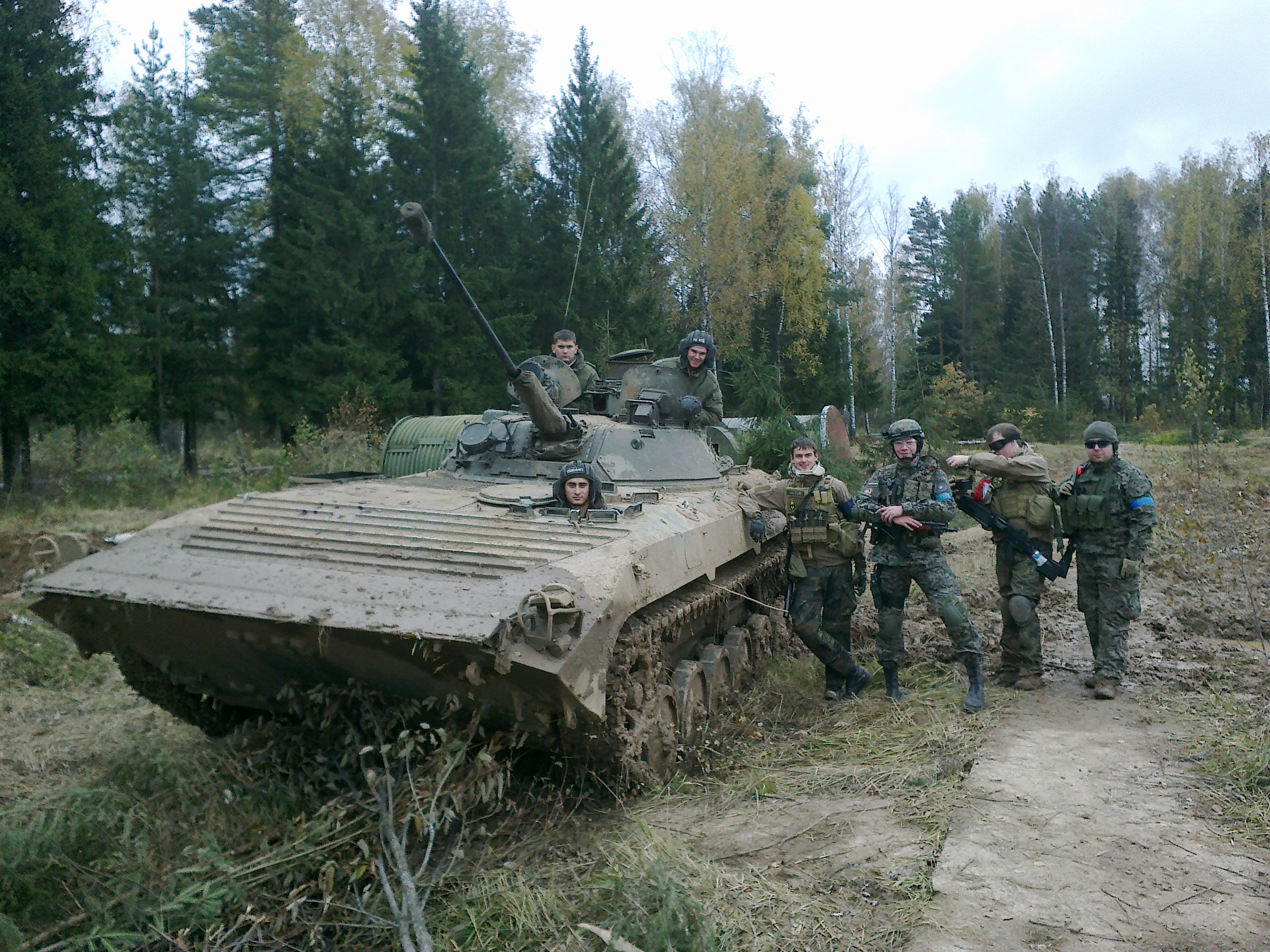 Надо отметить, что периодически бабахало и бУхало, тут то мы и узнали, что стреляли танки, потом стреляли БТРы из КПВТ, ощущение непередаваемы!!! Это просто праздник какой то!!! Ожив двинули к переправе, по дороге завернули в поле, где стоял танк и БМП2, пофоткались у БМП и довольные двинули к переправе.